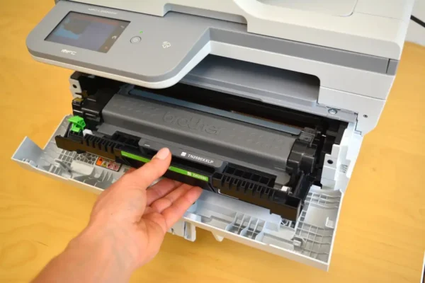 Лесно и семпло е поддържането на тонера. Интерфейсът на машината позволява по всяко време да проверяваме какво е нивото на тонер-касетата, измерено в проценти. Когато стане време да я подменим с нова, достатъчно е да отворим предния капак, за да извадим старата касета и да заложим новата – не са нужни нито специални инструменти, нито предварителни технически познания. Обичайно тонер-касетата е с капацитет за отпечатване на до 5000 страници, а машината идва с предварително заредена касета за до 1200 страници.